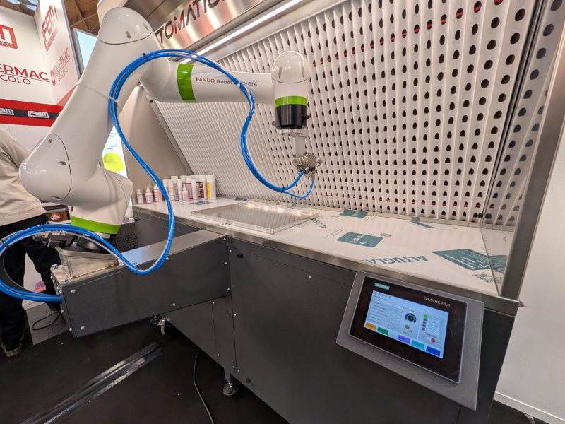In fiera abbiamo presentato una stazione robotizzata integrata ai nostri sistemi di aspirazione. Il risultato? Un processo che permette la ripetitività dei movimenti nelle decorazioni a spruzzo massive tramite ricette preimpostate che lavorano in sinergia con le nostre cabine.